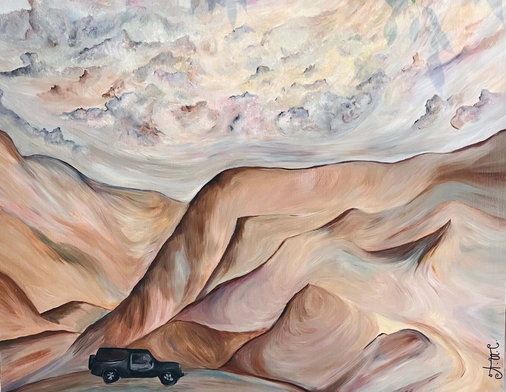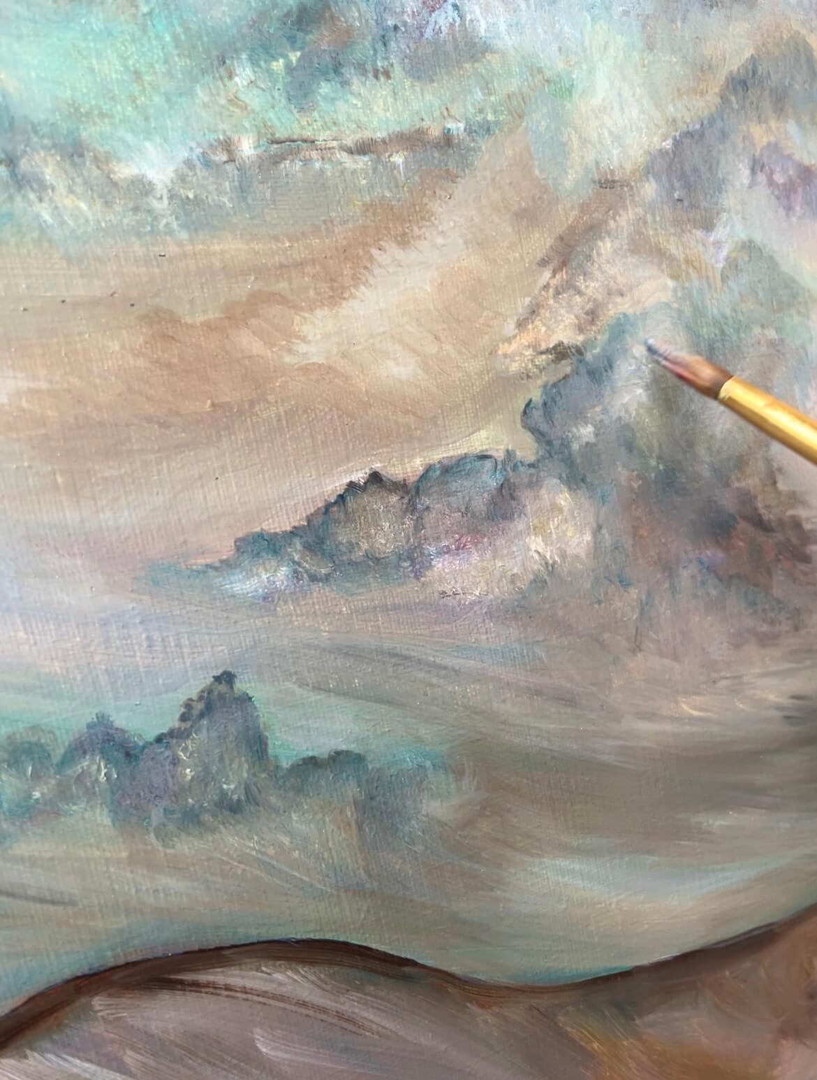 Меня попросили написать ее для кофейни, единственный критерий – цветовая гамма. Конкретной идеи не было, я не знала, что именно буду писать, пока в один день не нашла свою старую акварельную картину, на которой изображены серые горы и розоватое небо с просветами. Она была очень потрепанной и получилась случайно, я решила, что нужно продлить ей жизнь и использовать за основу для заказа. На название вдохновила конкретная песня исполнителя Far Caspian «Let’s Go Outside», которая вызывает чувство легкости, свободы, спонтанности.